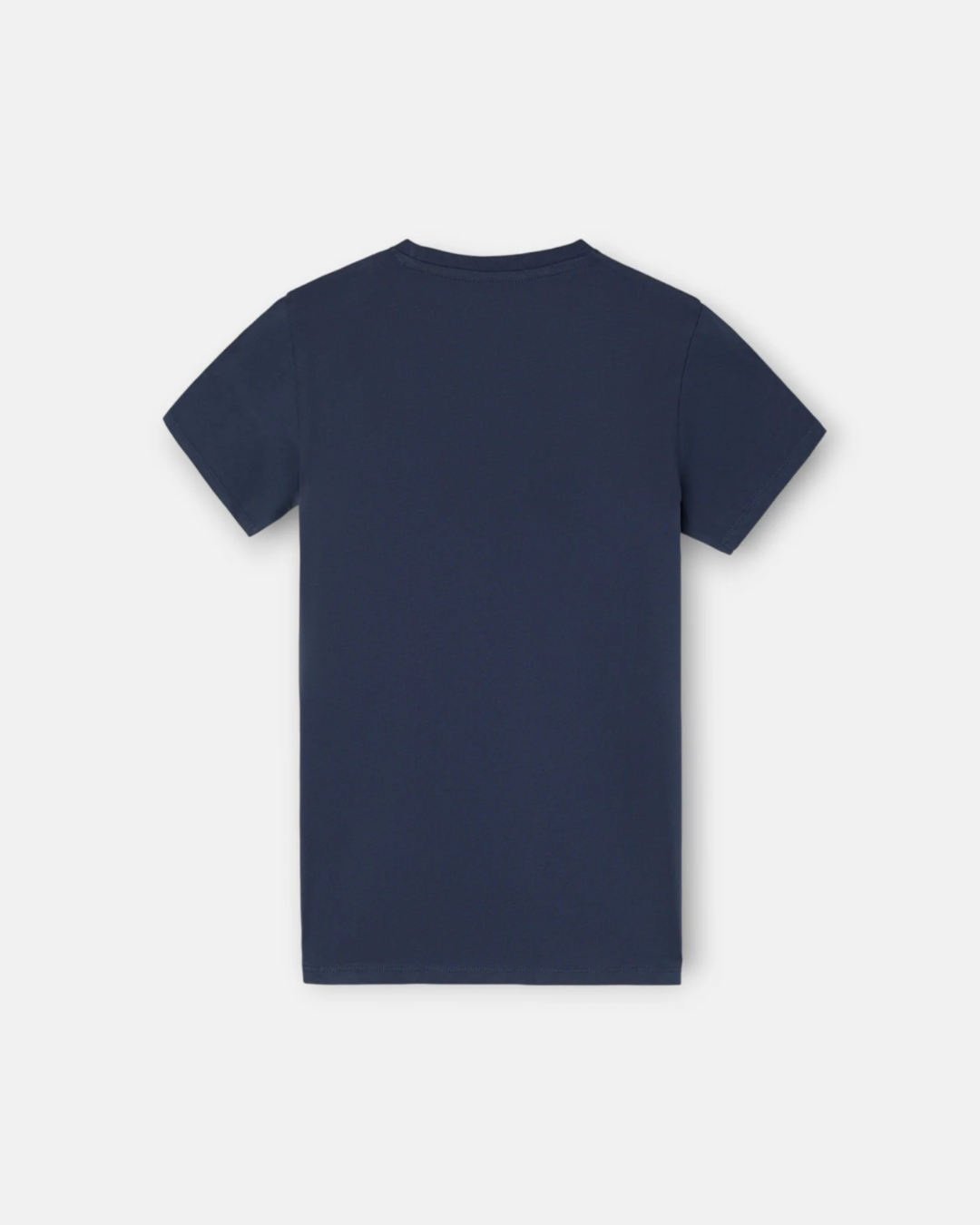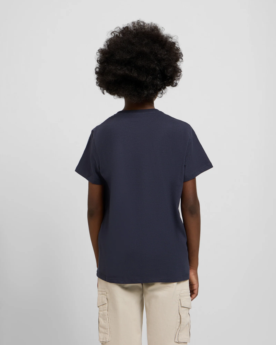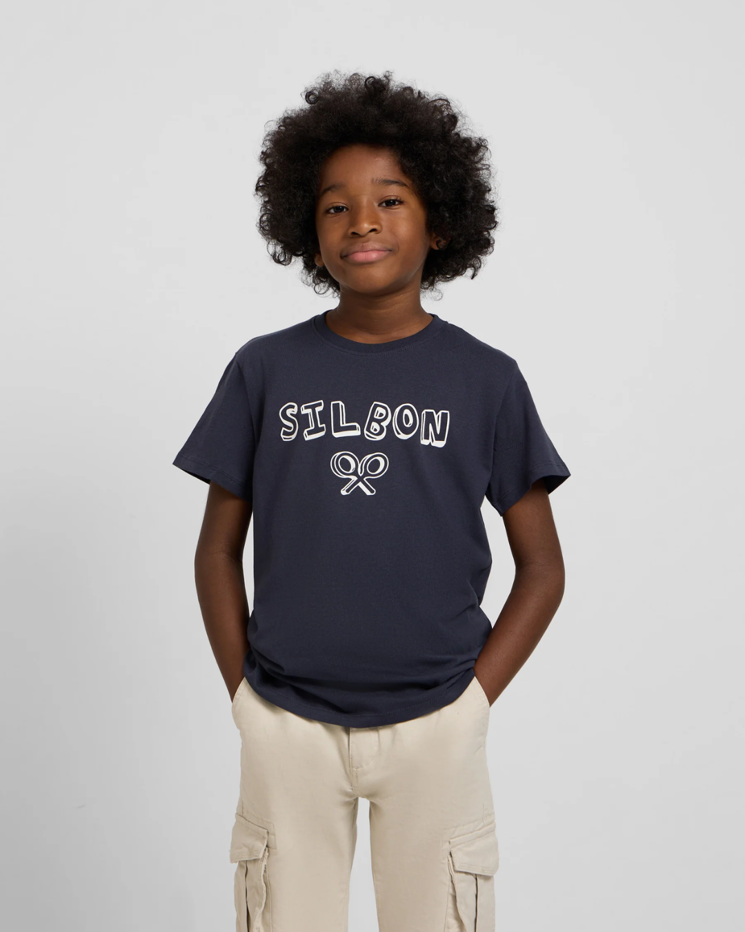 Kids' t-shirt made from 100% cotton. It features a round neck and short sleeves. It has a multicoloured letter print on the torso.