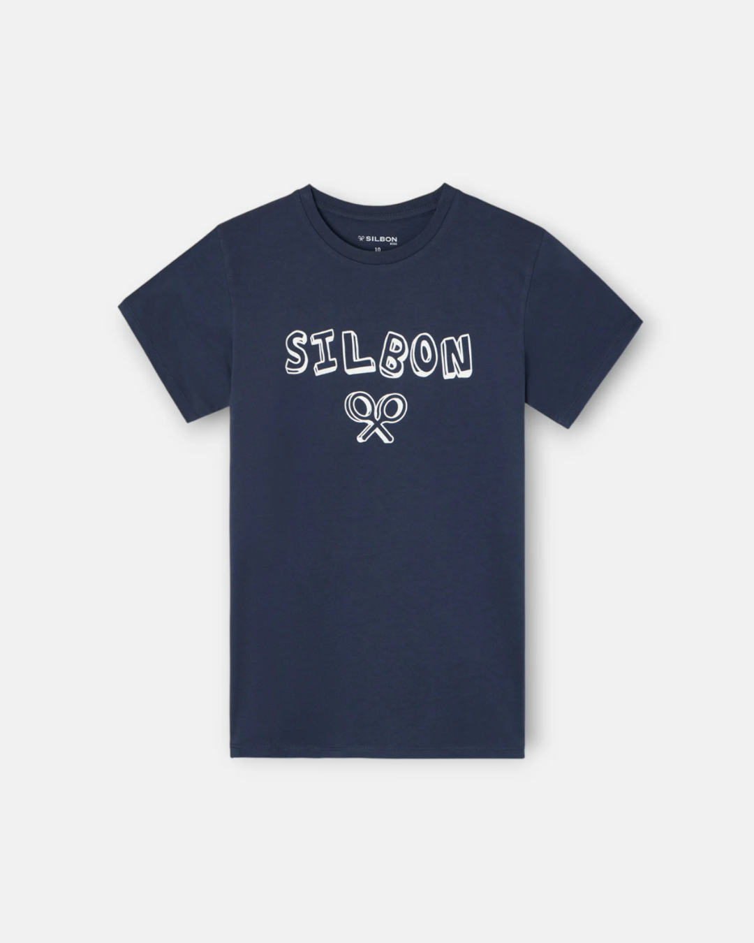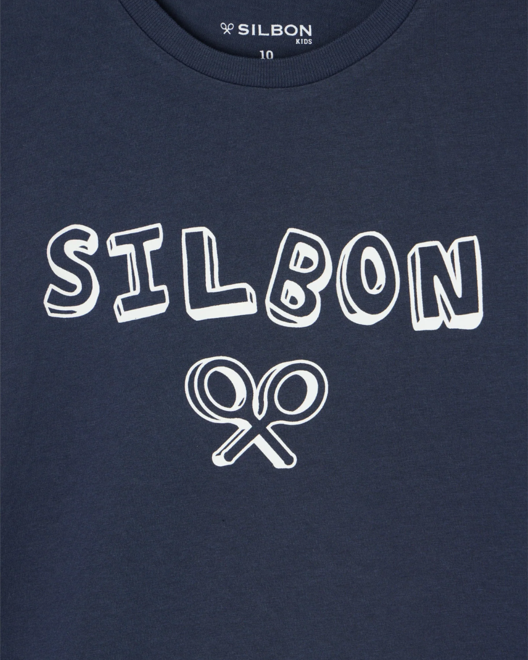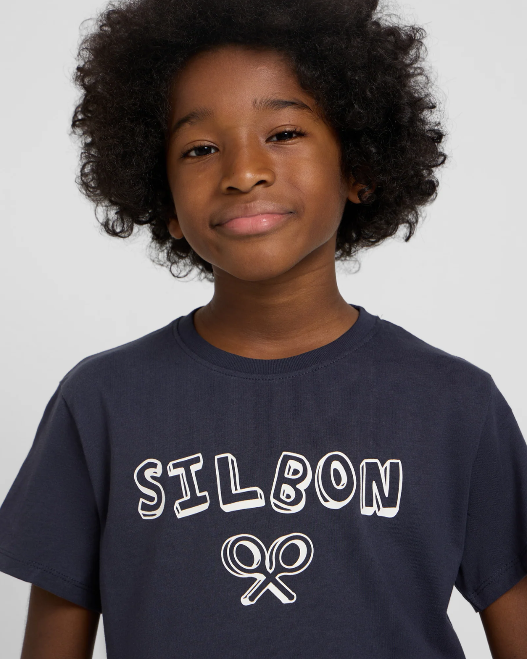 Kids' t-shirt made from 100% cotton. It features a round neck and short sleeves. It has a multicoloured letter print on the torso.