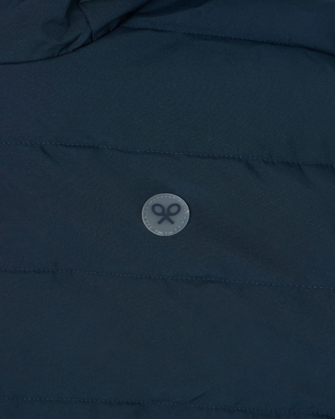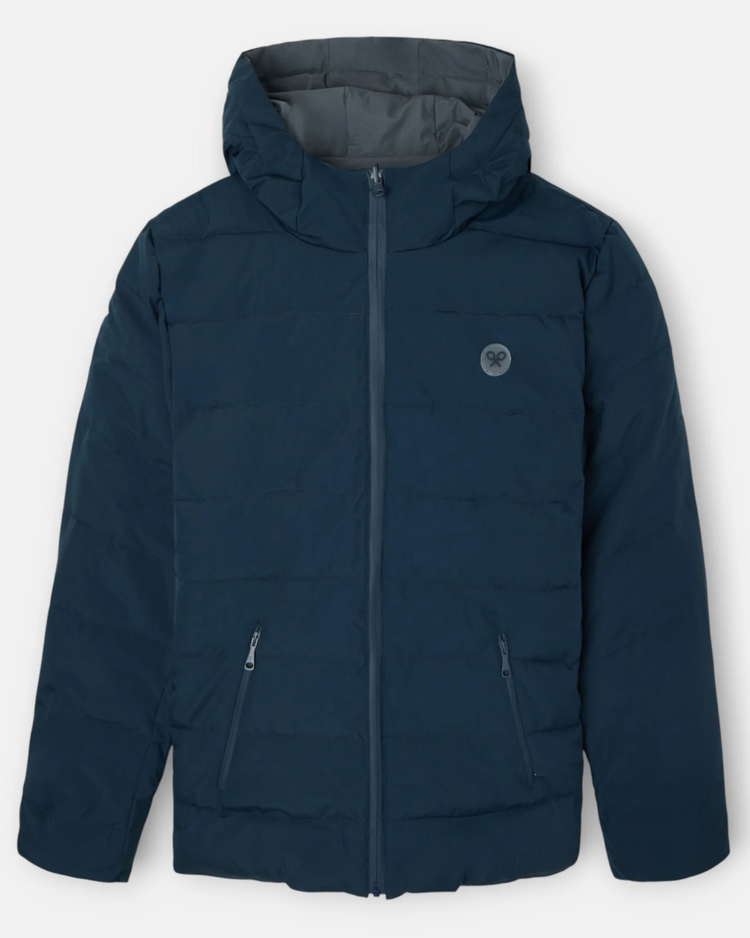 Reversible navy and gray technical coat with a regular fit. It features a front closure and heat-sealed zippered front pockets, custom pull tabs, and a high collar with a hood. It features a micro-injected racquet patch on the torso.