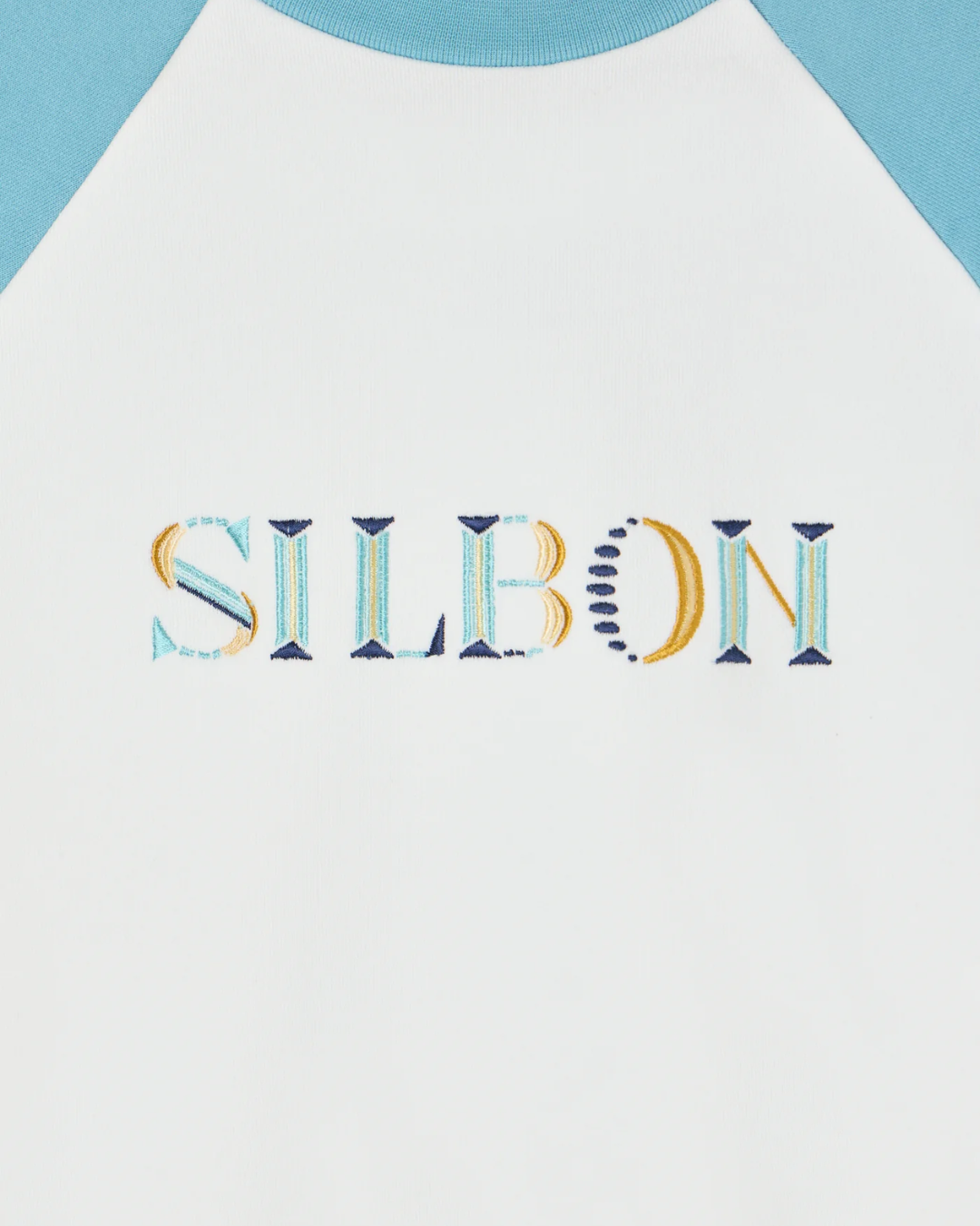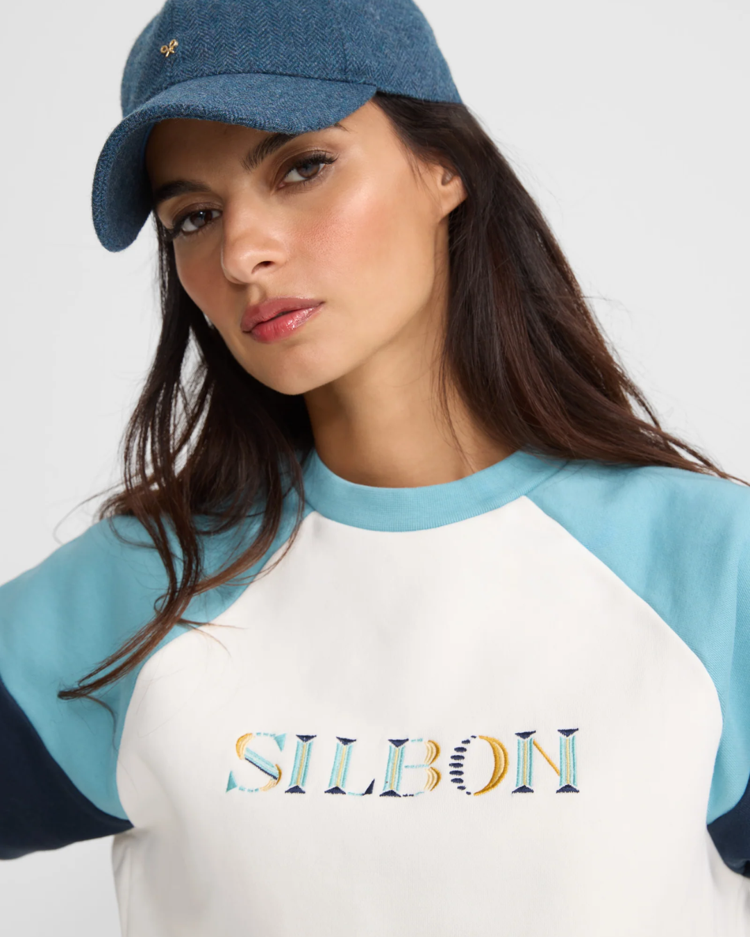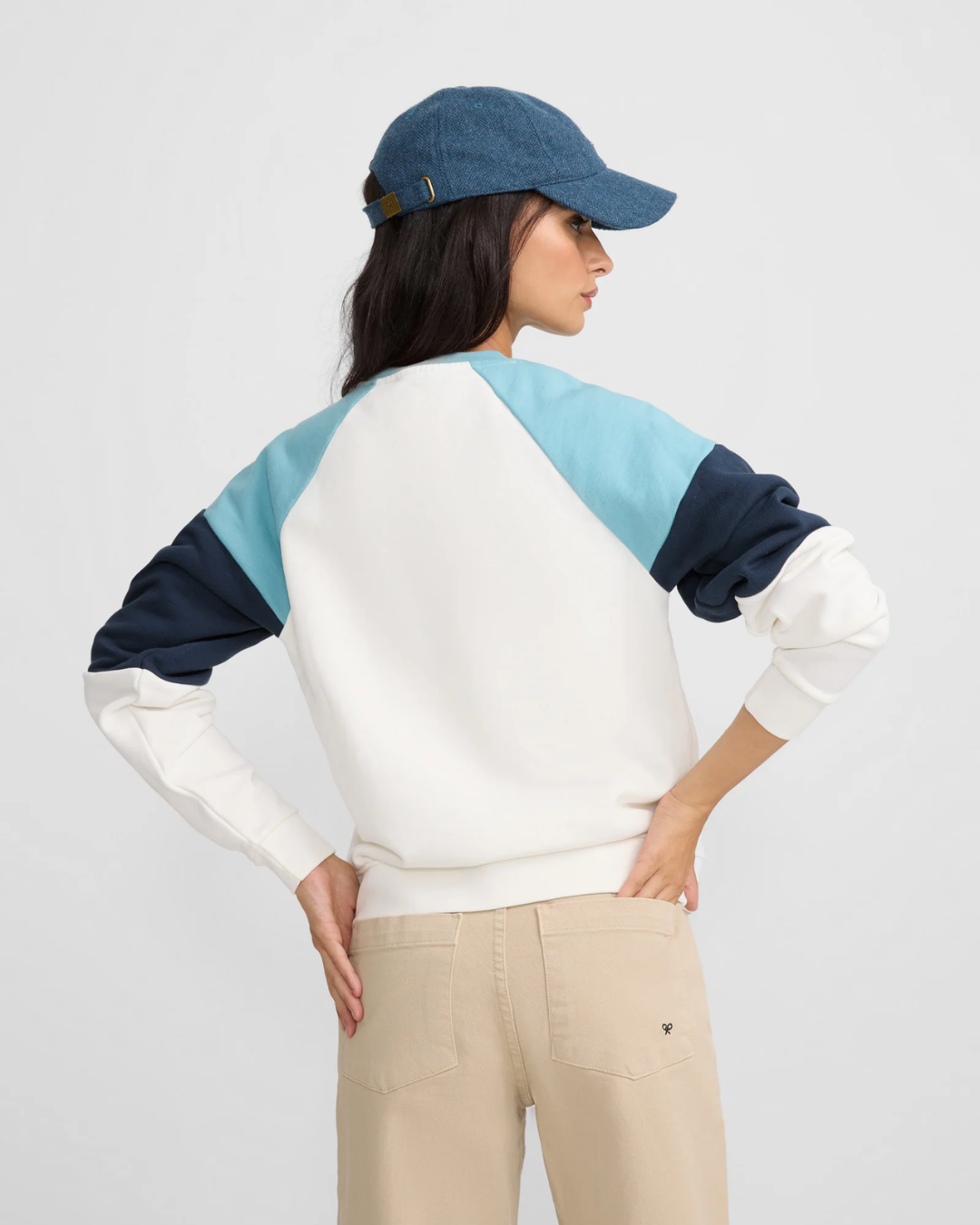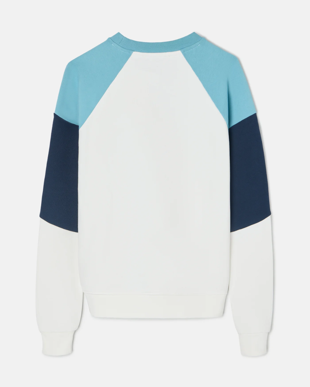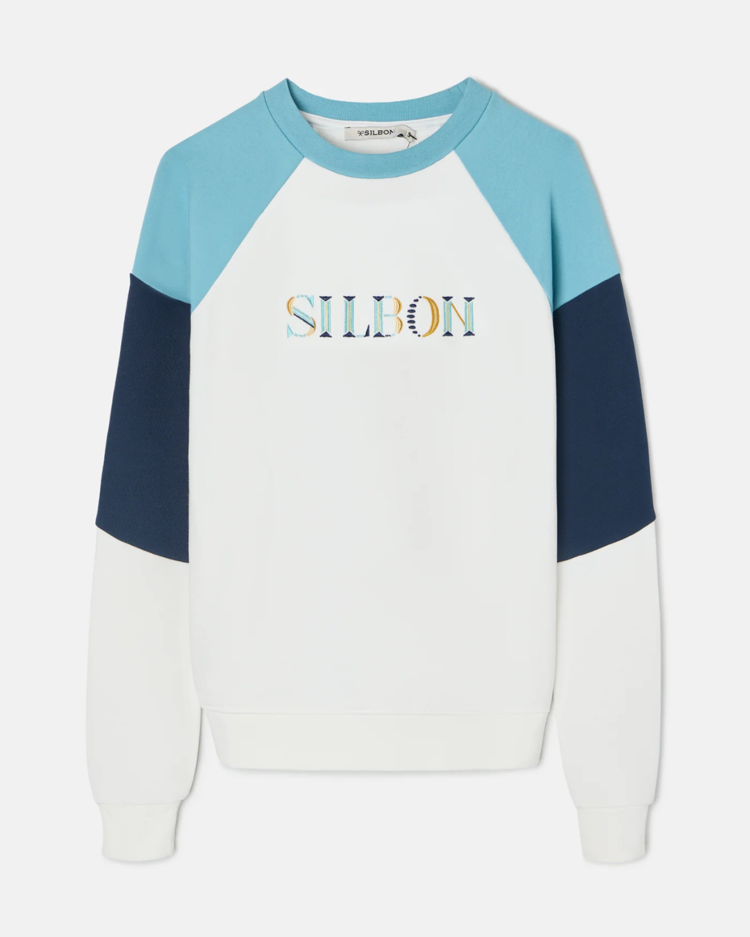 Women's white sweatshirt made from 100% cotton. Features multicolored embroidered lettering on the torso and contrasting light blue and navy blue shoulders. It has a round neck and straight sleeves with elastic cuffs.