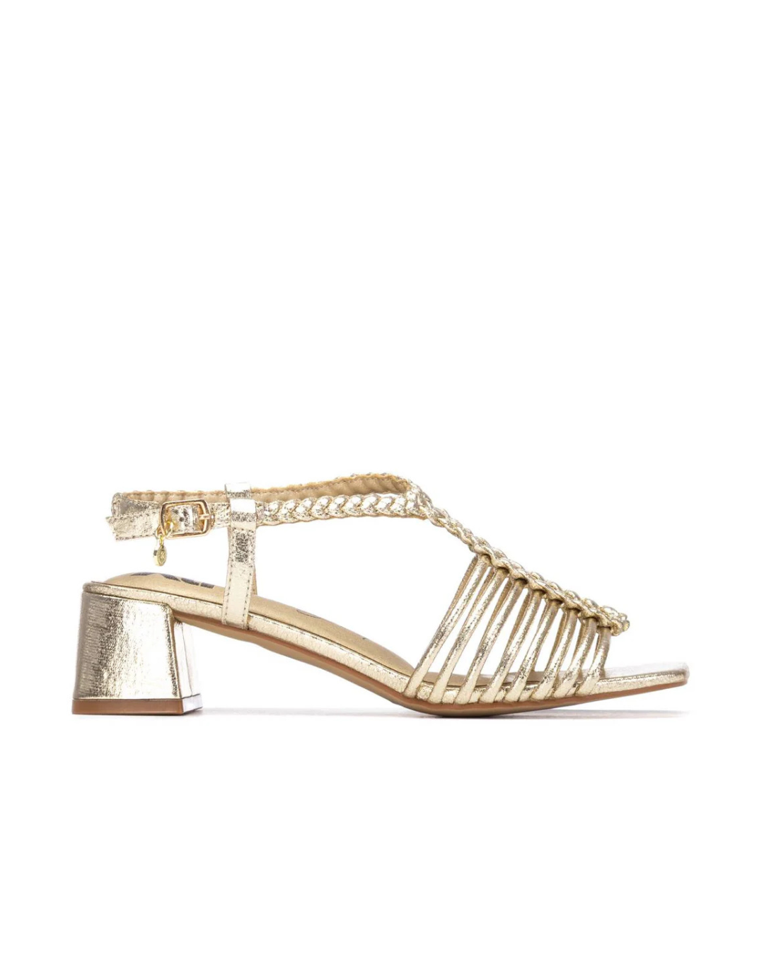 Women's sandal by Xti. Made from a metallic-effect, leather-look material, it features a delicate design of thin straps that form an elegant upper. A strap connects the upper to the ankle strap, which is adjustable with a buckle for added comfort. The 5 cm block heel provides stability and style, perfect for a sophisticated and comfortable look. This model has received vegan certification from PETA (Animal Rights Organization).