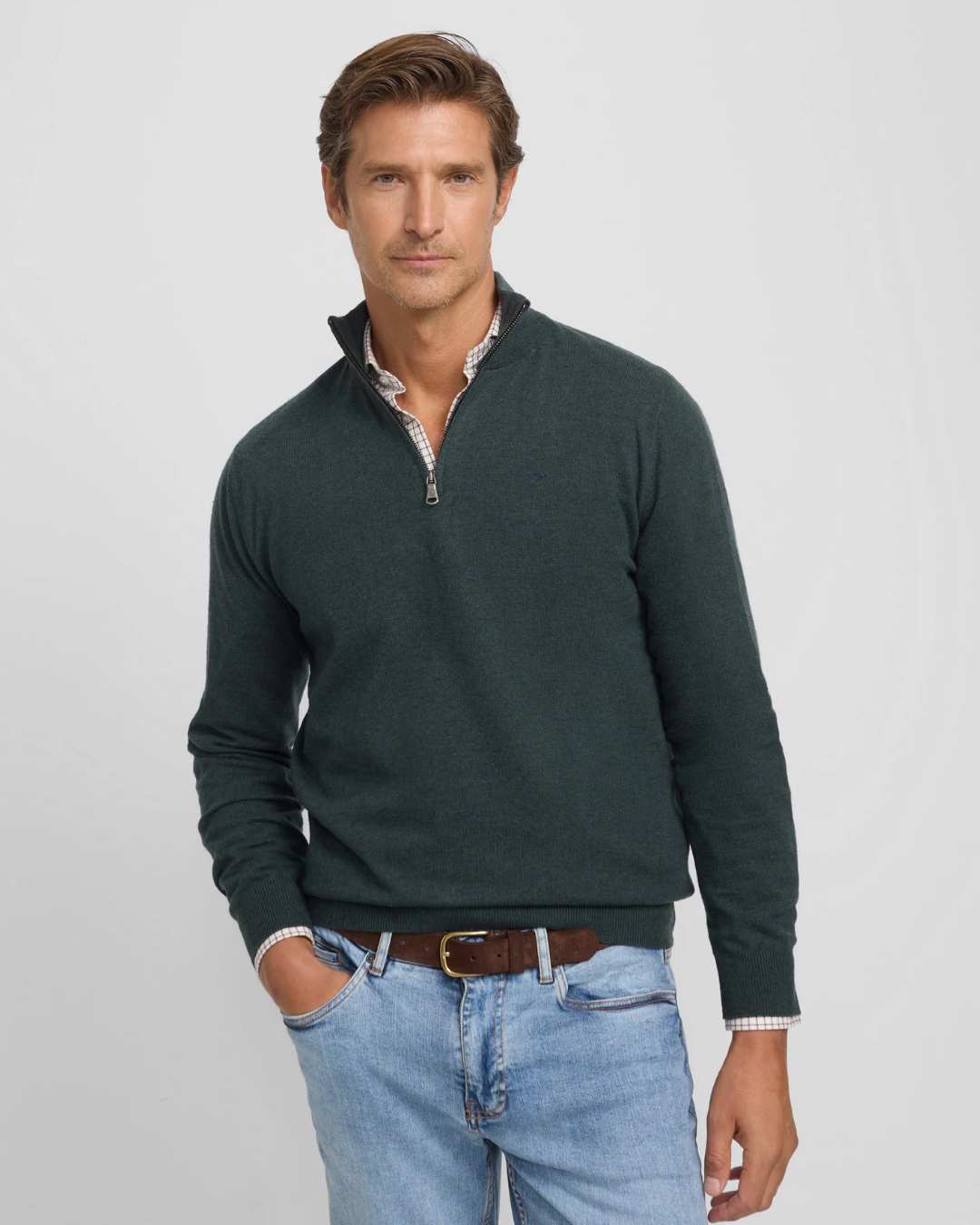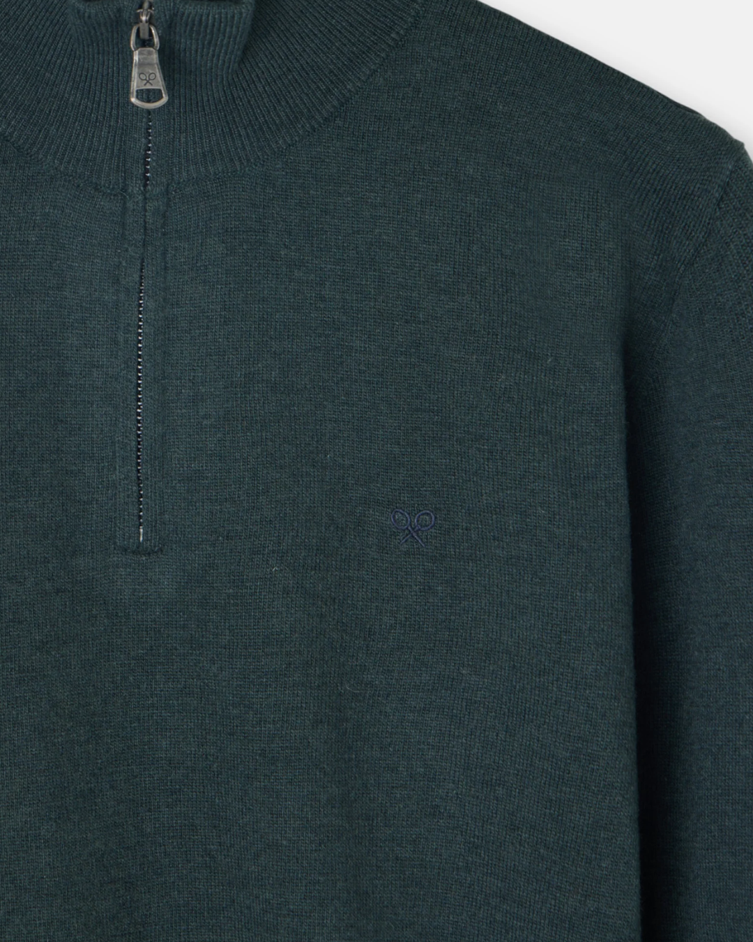 Plain green sweater made from a wool blend with a regular fit. It features a stand-up collar with a half-zip closure and a custom pull tab, and long sleeves. It has a navy blue embroidered tennis racket detail on the torso.