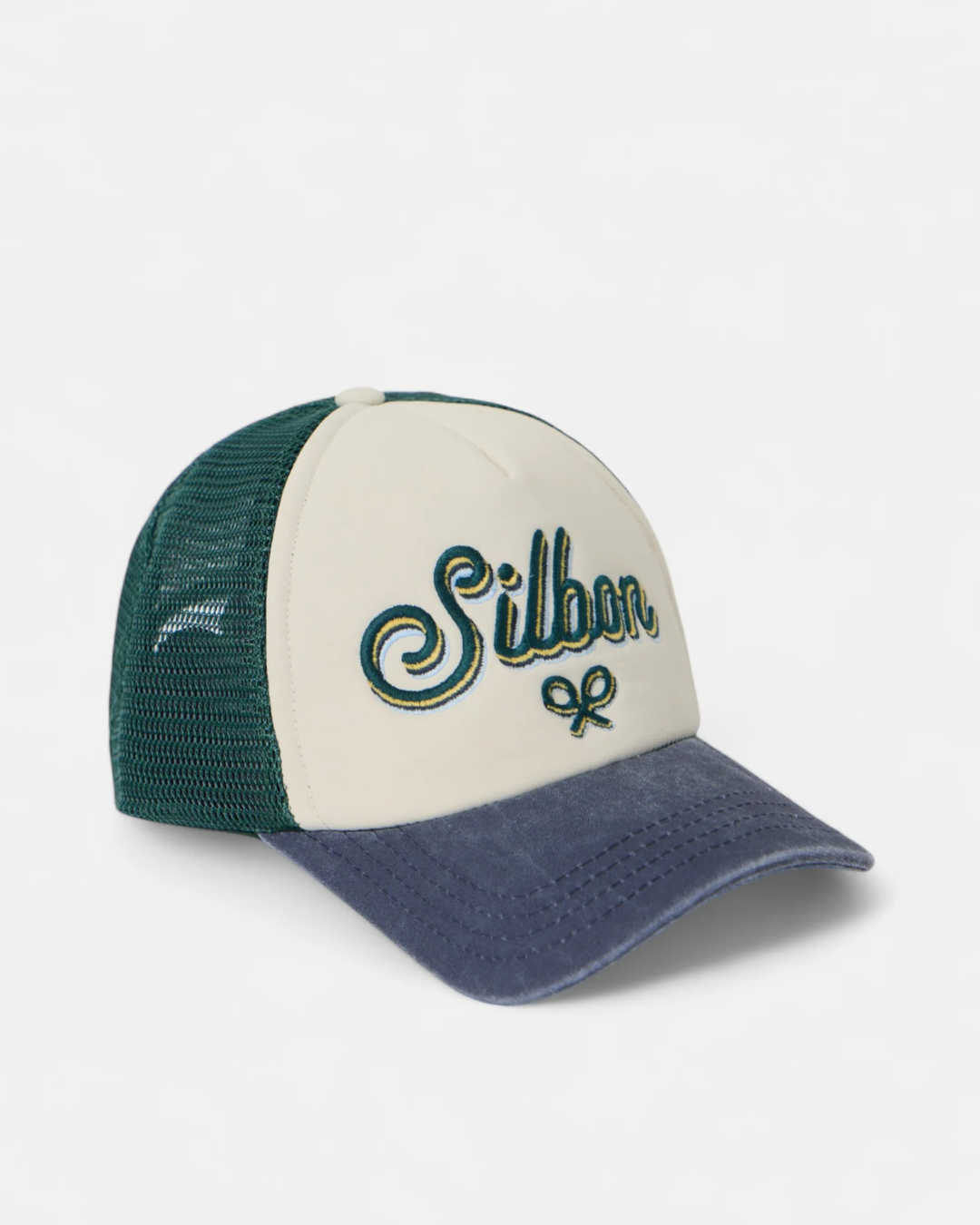 Kids' "Trucker" cap in navy blue and green, made of cotton and polyester. Features two-tone custom embroidery on the crown. Includes an adjustable strap and a custom back label.