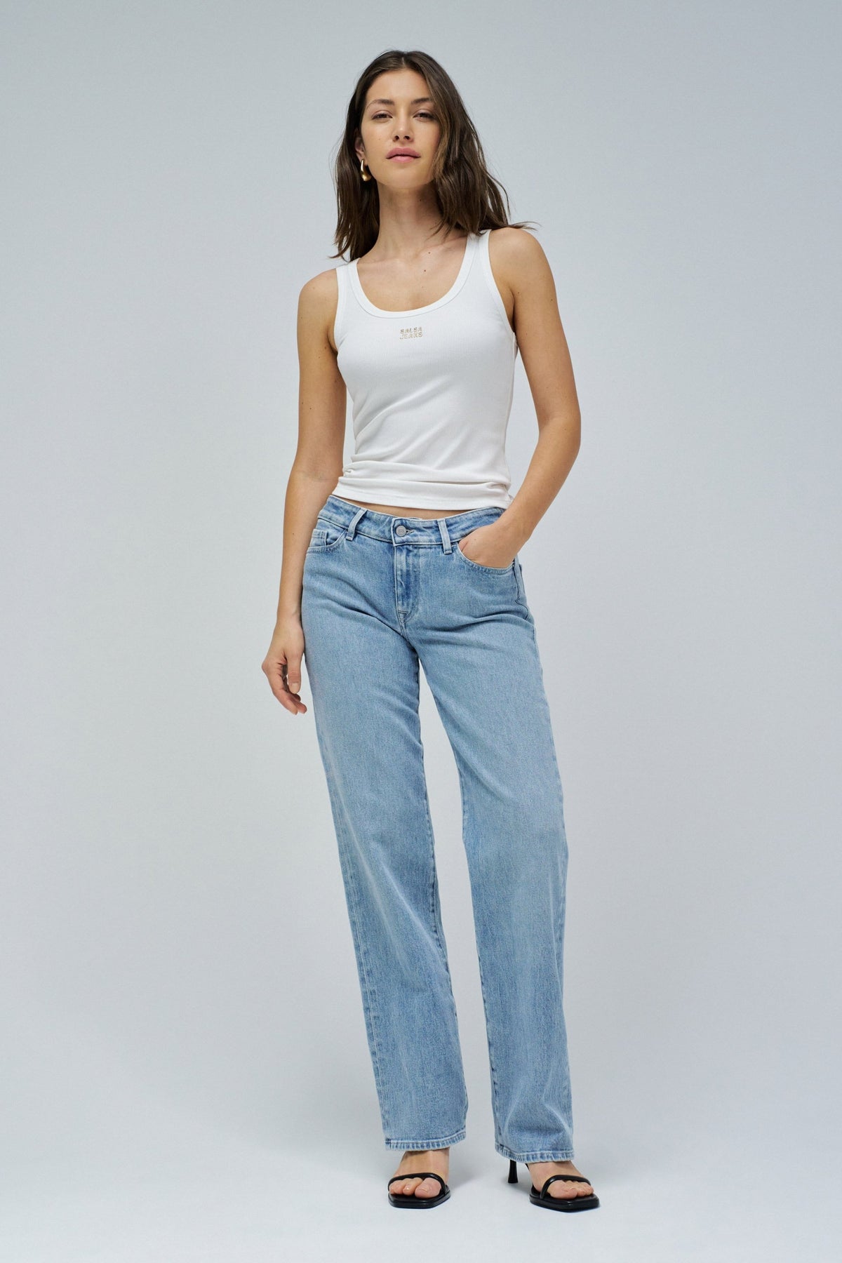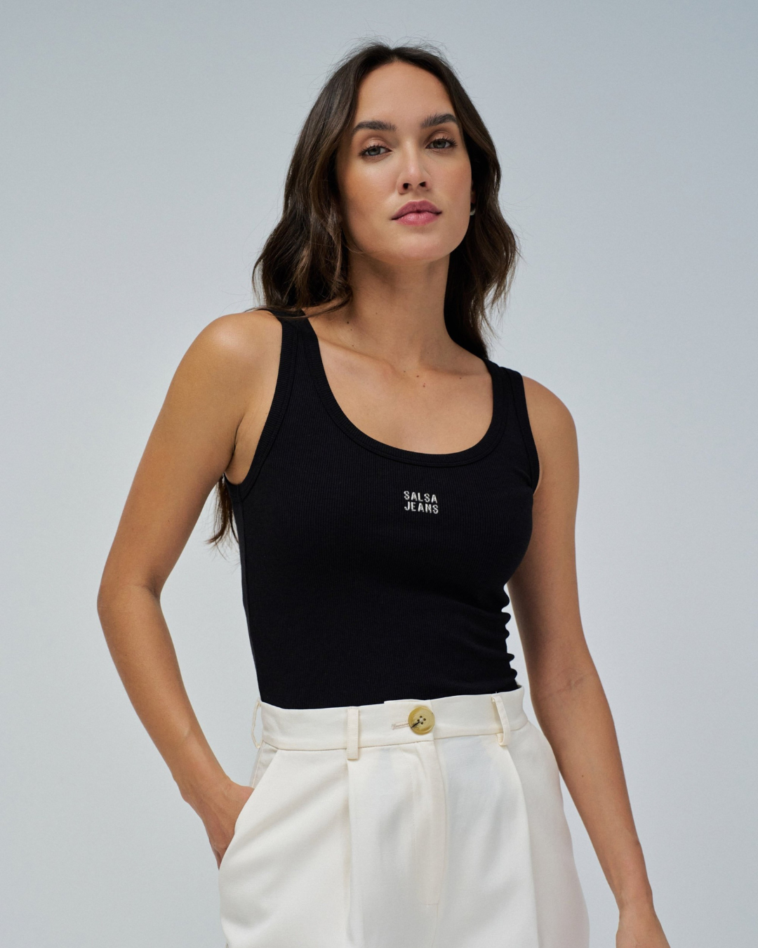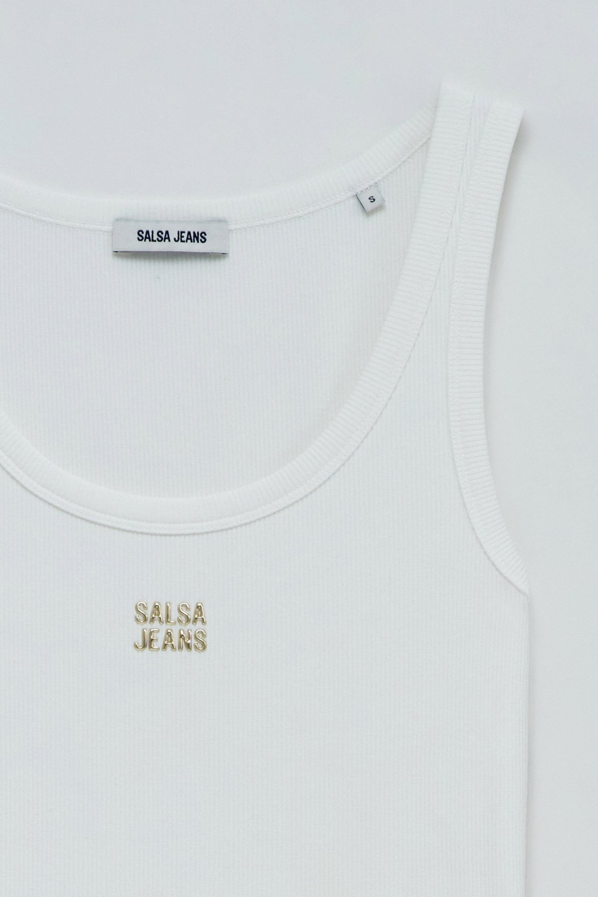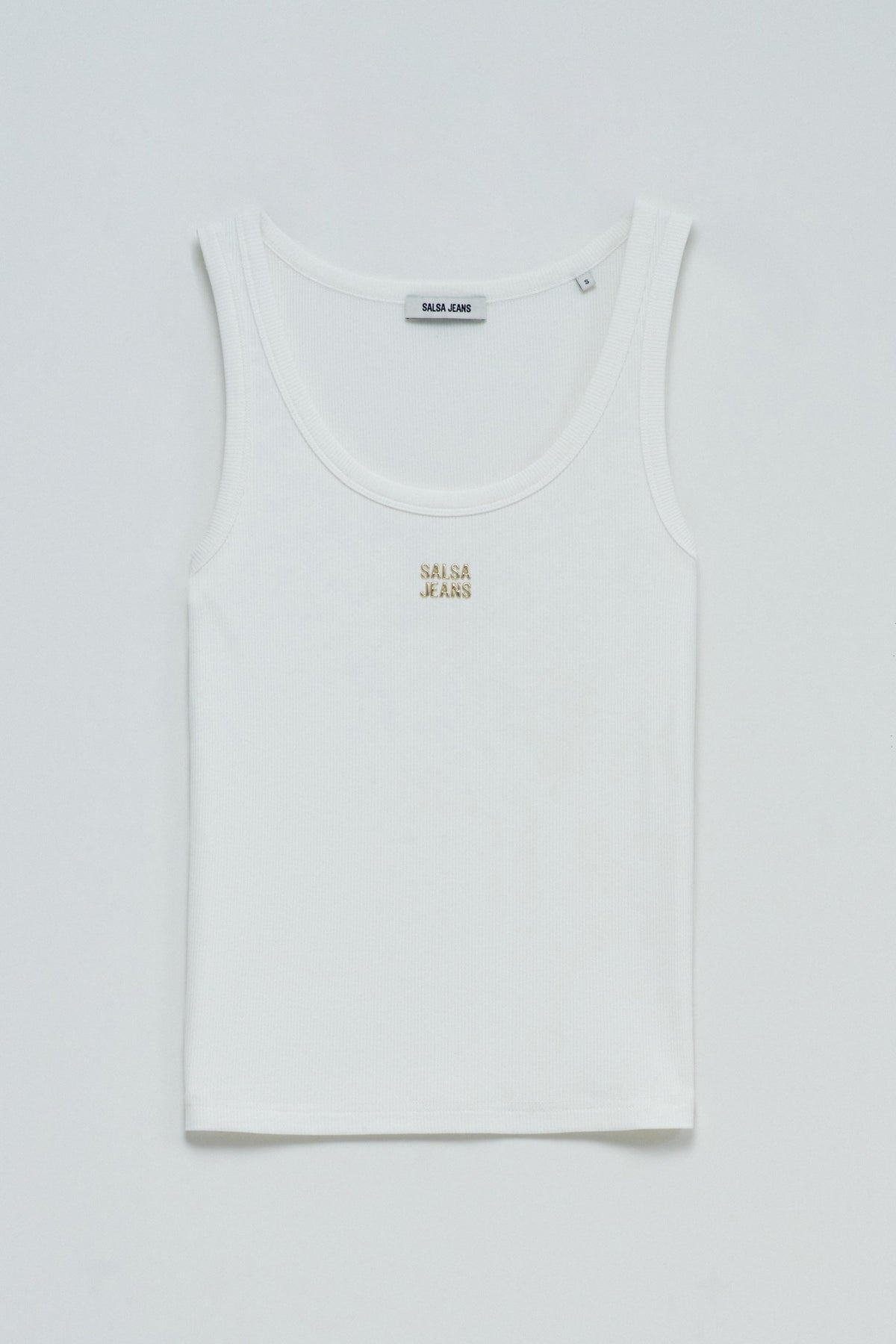 This basic ribbed knit top is that essential piece that goes with everything. Slim cut and sleeveless, it fits perfectly to the body, ensuring comfort and a modern touch. The round neckline gives it a relaxed look, while the branding detail on the chest adds a subtle yet personality-filled touch. In classic white, it is an easy piece to match, whether with jeans, trousers or skirts.